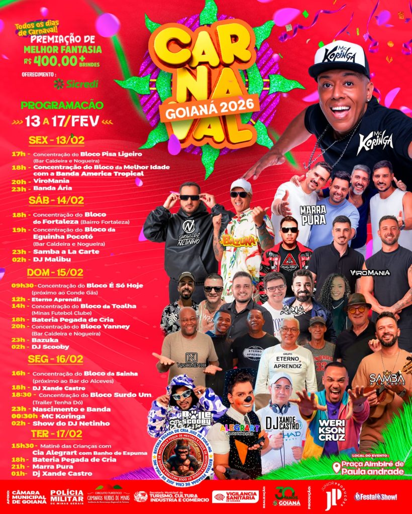 A Prefeitura Muinicipal torna pública a programação oficial do Carnaval Goianá 2026, que será realizado entre os dias 13 e 17 de fevereiro, com cinco dias de intensa folia, reunindo blocos tradicionais, shows musicais, atrações para todas as idades e muita animação.