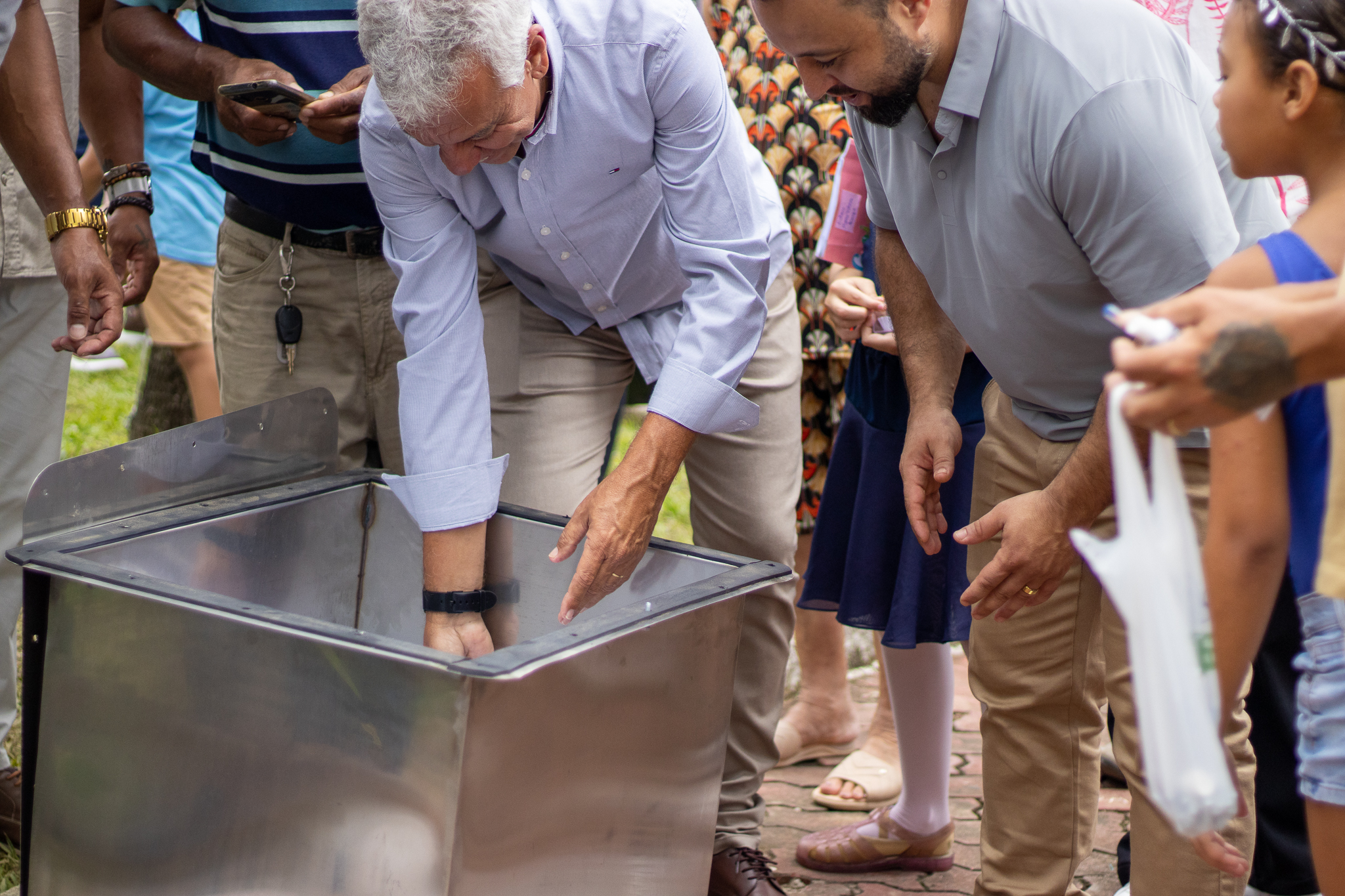 Um dos momentos mais marcantes da celebração foi o Lançamento da Cápsula do Tempo, carregado de emoção e simbolismo. Objetos e mensagens representando o presente de Goianá foram depositados com a promessa de serem revistos daqui a 70 anos, conectando gerações e reforçando o compromisso com o futuro.